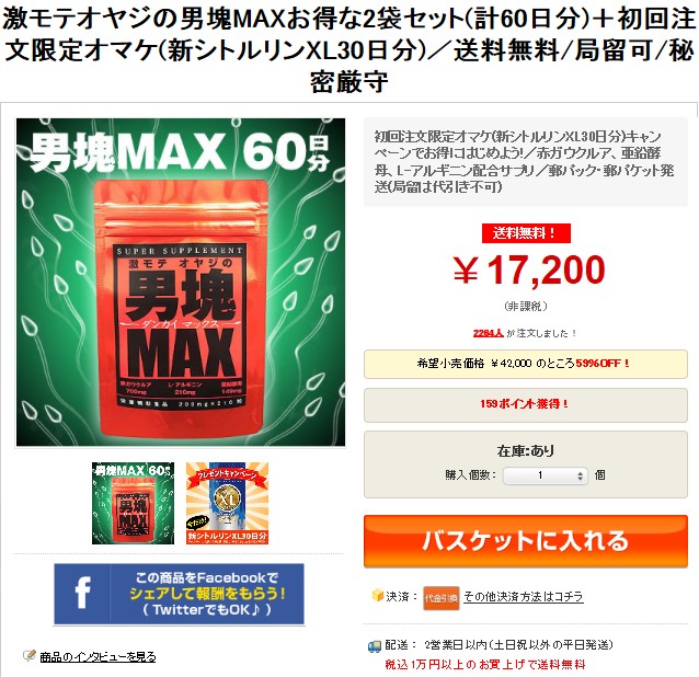 137 激モテオヤジの男塊MAXお得な2個セット【送料無料】, 激モテオヤジの男塊MAX!イザという時、ションボリしたくない時に。デキる男のリーサルウェポンです。 【送料無料】 男塊MAX の詳細を見る · 【送料無料】 シトルリンXLプレミアム ... 286