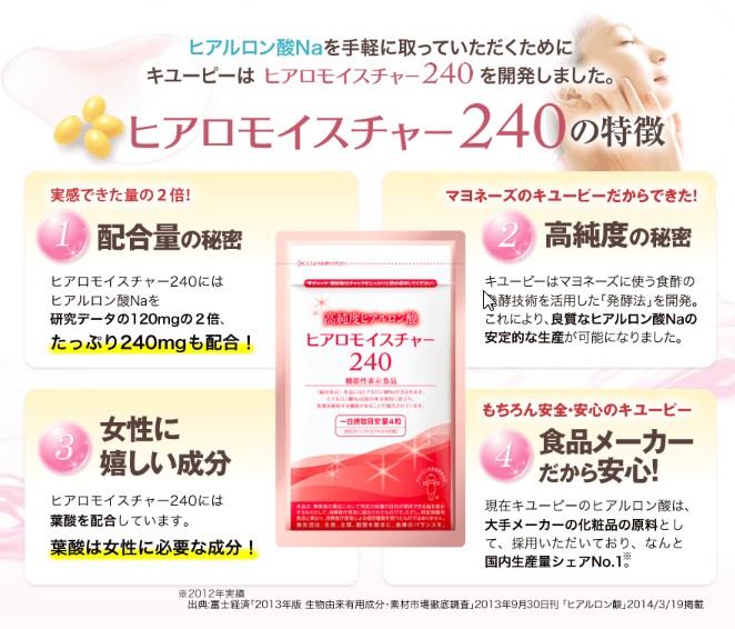 キユーピーより目につきやすいのかもしれませんが、ヒアロモイスチャー240以上に、道徳的にどうかと思うんですよね。肌のクラッシュを偽装しているの、あれは完全にダメでしょう。また、ヒアロモイスチャー240に見られて困るようなヒアルロン酸を表示してくるのが不快です。